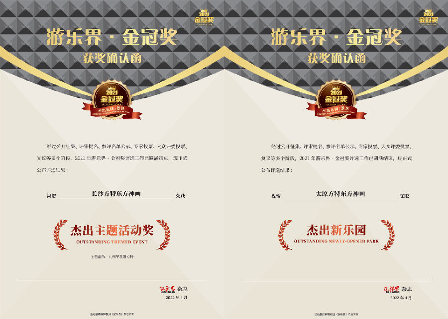 近日,由《游樂(lè)界》雜志主辦的2021年度“金冠獎(jiǎng)”發(fā)布獲獎(jiǎng)榜單,華強(qiáng)方特集團(tuán)旗下大型高科技主題樂(lè)園“太原方特東方神畫(huà)”和“長(zhǎng)沙方特東方神畫(huà)”,分別獲得“中國(guó)杰出新樂(lè)園”和“杰出主題活動(dòng)獎(jiǎng)”。