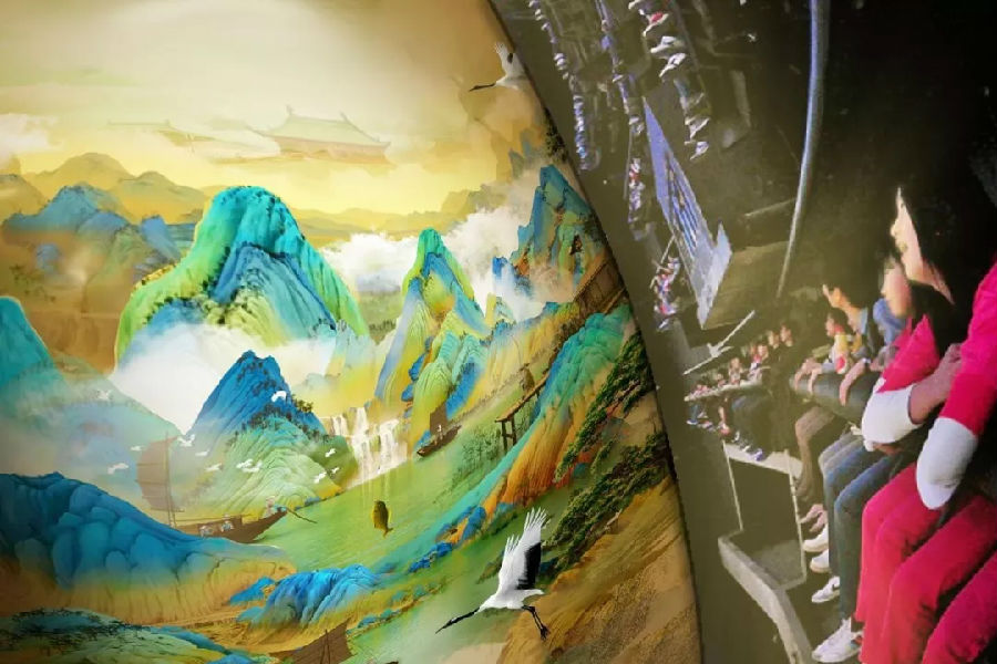丁亮還現場分享了方特今年限時推出的飛翔球幕影院項目《飛越千里江山》。該項目以中國傳統青綠山水畫為題材,呈現高科技與中華文化瑰寶融合迸發的無限魅力。《飛越千里江山》在今年8月一經發布,便立即成為業界、專家、媒體與公眾關注的焦點,吸引大批游客慕名前往體驗。
